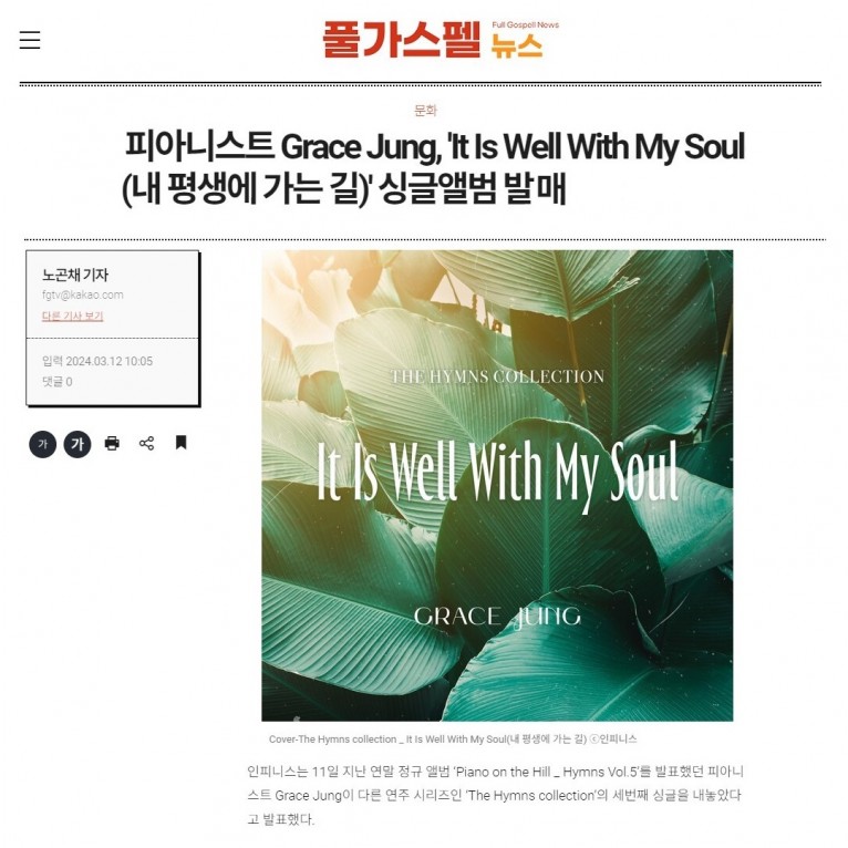 [기사] 피아니스트 Grace Jung, 'It Is Well With My Soul(내 평생에 가는 길)' 싱글앨범 발매(풀가스펠뉴스)