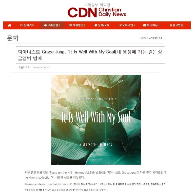 [기사] 피아니스트 Grace Jung, 'It Is Well With My Soul(내 평생에 가는 길)' 싱글앨범 발매(기독일보 씨디엔)