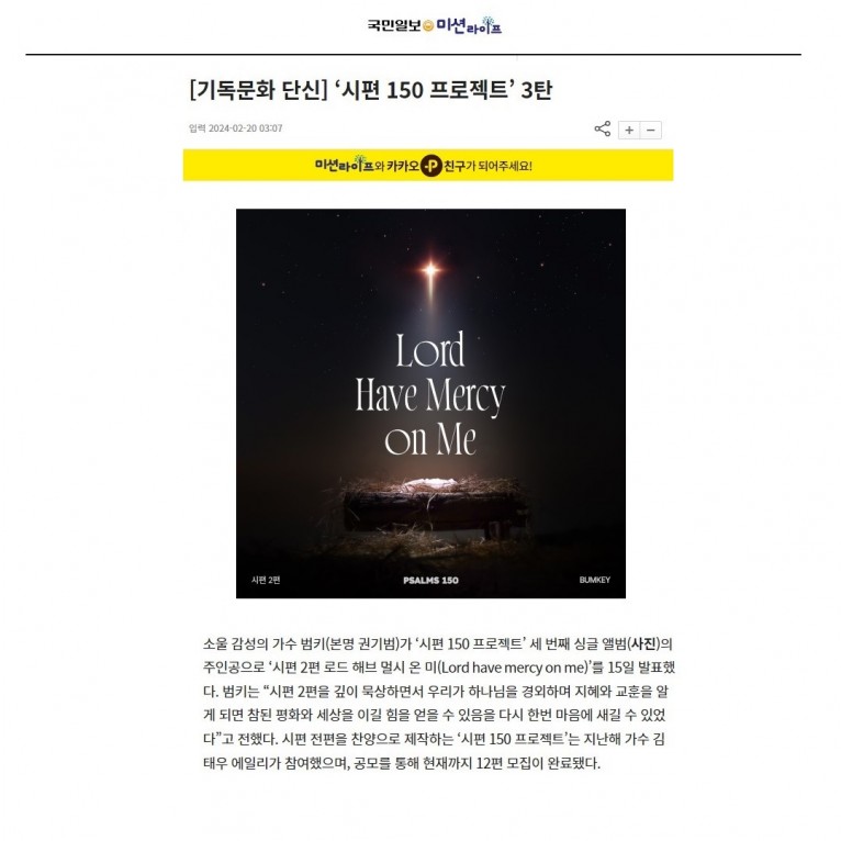 [기사] ‘시편 150 프로젝트’ 3탄(국민일보)