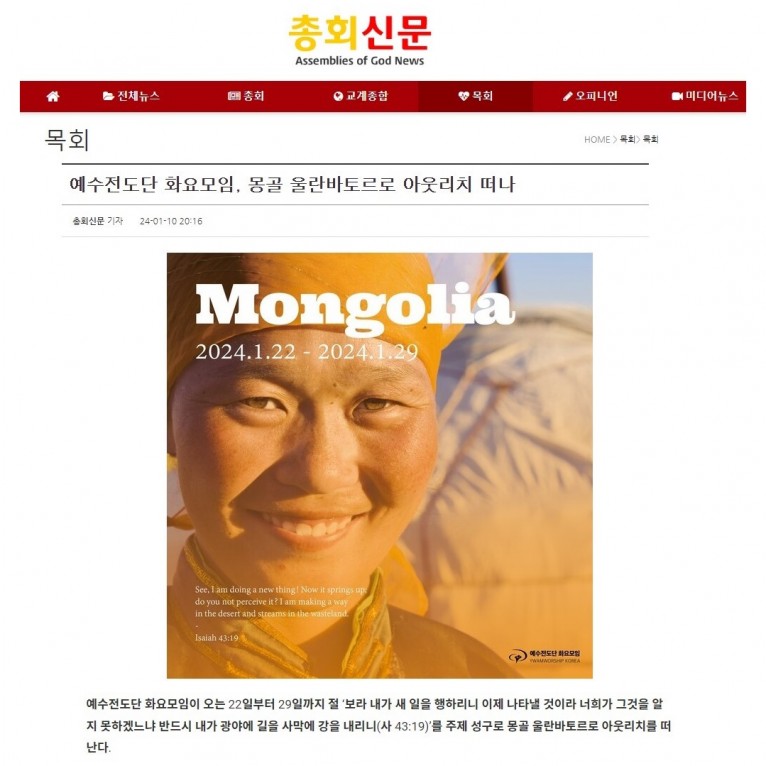 [기사] 예수전도단 화요모임, 몽골 울란바토르로 아웃리치 떠나(총회신문)