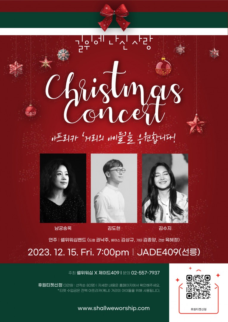 이 공연의 취지에 함께 하는 남궁송옥(‘죽으면 죽으리라’), 김도현(‘성령이 오셨네’), 김수지(‘이 시간 너의 맘속에’) 등의 사역자와 쉘위워십밴드(드럼 권낙주, 베이스 김상규, 기타 김종양, 건반 육혜정)가 힘을 모아 기쁜 크리스마스 콘서트 무대를 선사한다.