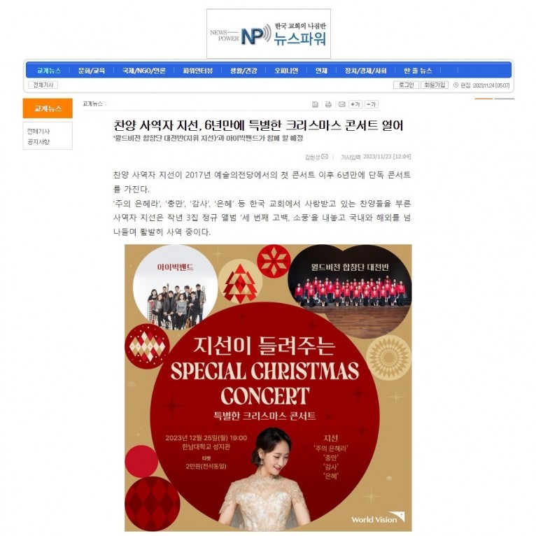 [기사] 찬양 사역자 지선, 6년만에 특별한 크리스마스 콘서트 열어 (뉴스파워)