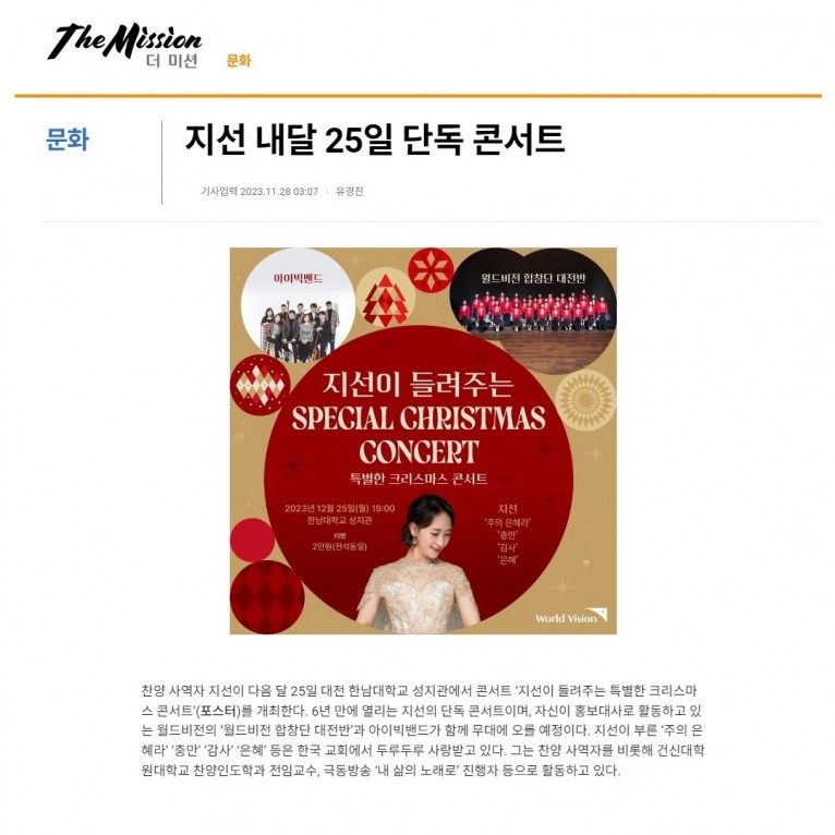 찬양 사역자 지선이 다음 달 25일 대전 한남대학교 성지관에서 콘서트 ‘지선이 들려주는 특별한 크리스마스 콘서트’(포스터)를 개최한다. 6년 만에 열리는 지선의 단독 콘서트이며, 자신이 홍보대사로 활동하고 있는 월드비전의 ‘월드비전 합창단 대전반’과 아이빅밴드가 함께 무대에 오를 예정이다. 지선이 부른 ‘주의 은혜라’ ‘충만’ ‘감사’ ‘은혜’ 등은 한국 교회에서 두루두루 사랑받고 있다. 그는 찬양 사역자를 비롯해 건신대학원대학교 찬양인도학과 주임교수, 극동방송 ‘내 삶의 노래로’ 진행자 등으로 활동하고 있다.