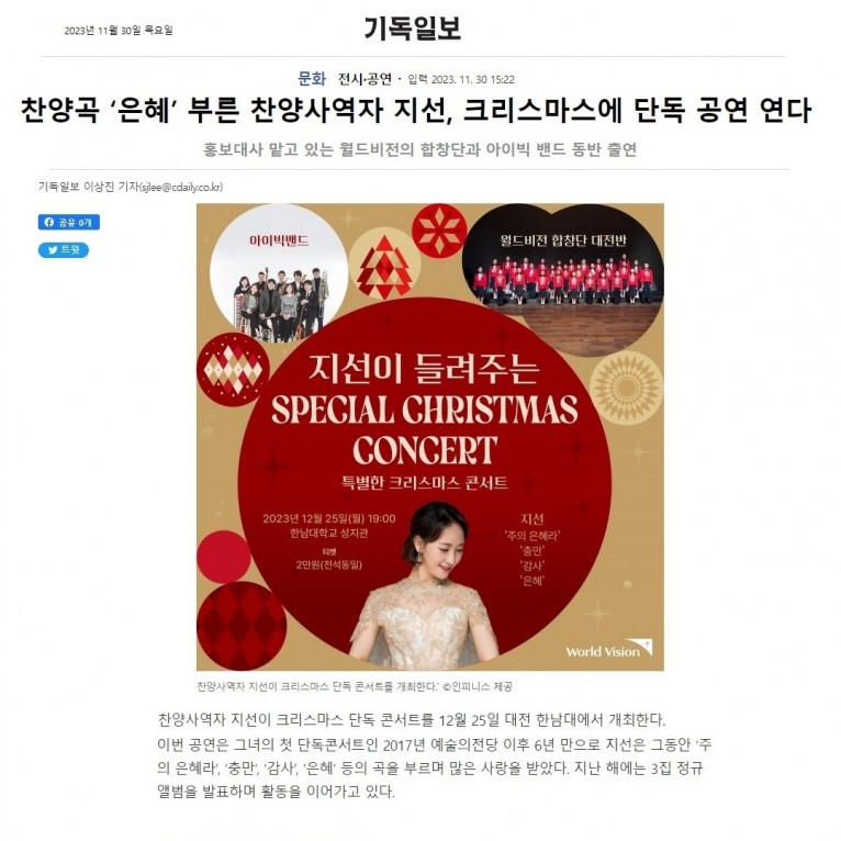 [기사] 찬양곡 ‘은혜’ 부른 찬양사역자 지선, 크리스마스에 단독 공연 연다(기독일보)
