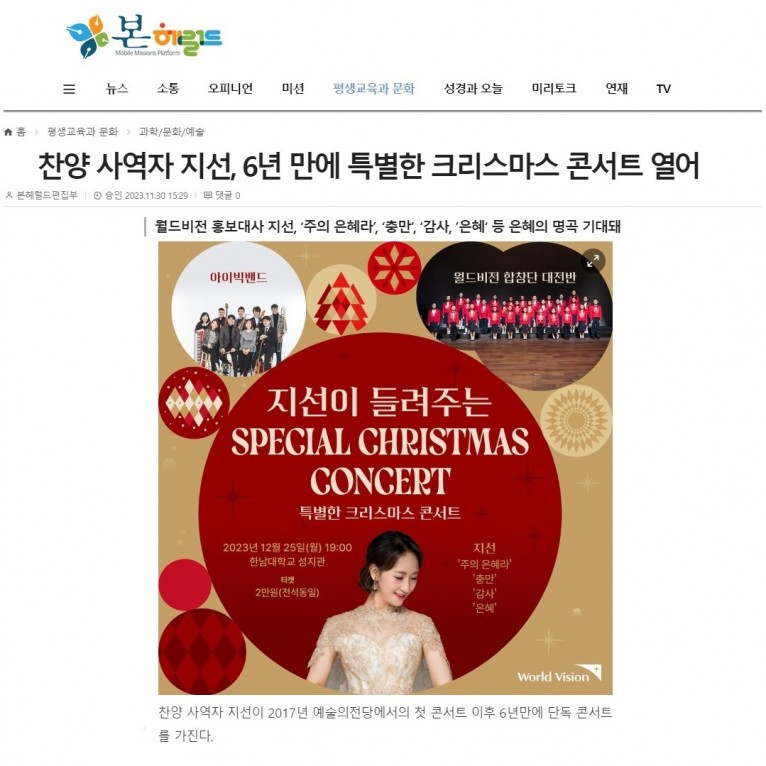 [기사] 찬양 사역자 지선, 6년 만에 특별한 크리스마스 콘서트 열어(본헤럴드)