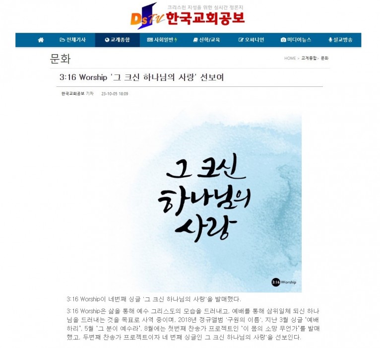 뮤직타임 [기사] 3:16 Worship '그 크신 하나님의 사랑' 선보여(한국교회공보)