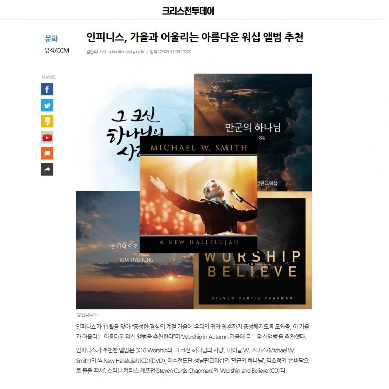 인피니스가 11월을 맞아 “풍성한 결실의 계절 가을에 우리의 귀와 영혼까지 풍성해지도록 도와줄, 이 가을과 어울리는 아름다운 워십 앨범을 추천한다”며 ‘Worship in Autumn 가을에 듣는 워십앨범’을 추천했다.