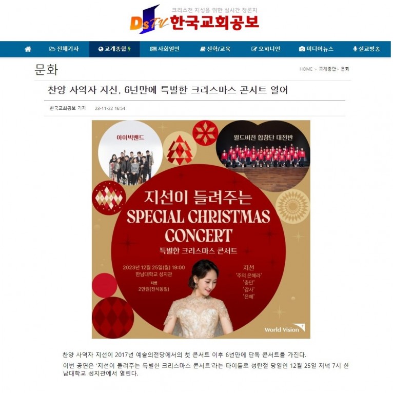 [기사] 찬양 사역자 지선, 6년만에 특별한 크리스마스 콘서트 열어(한국교회공보)