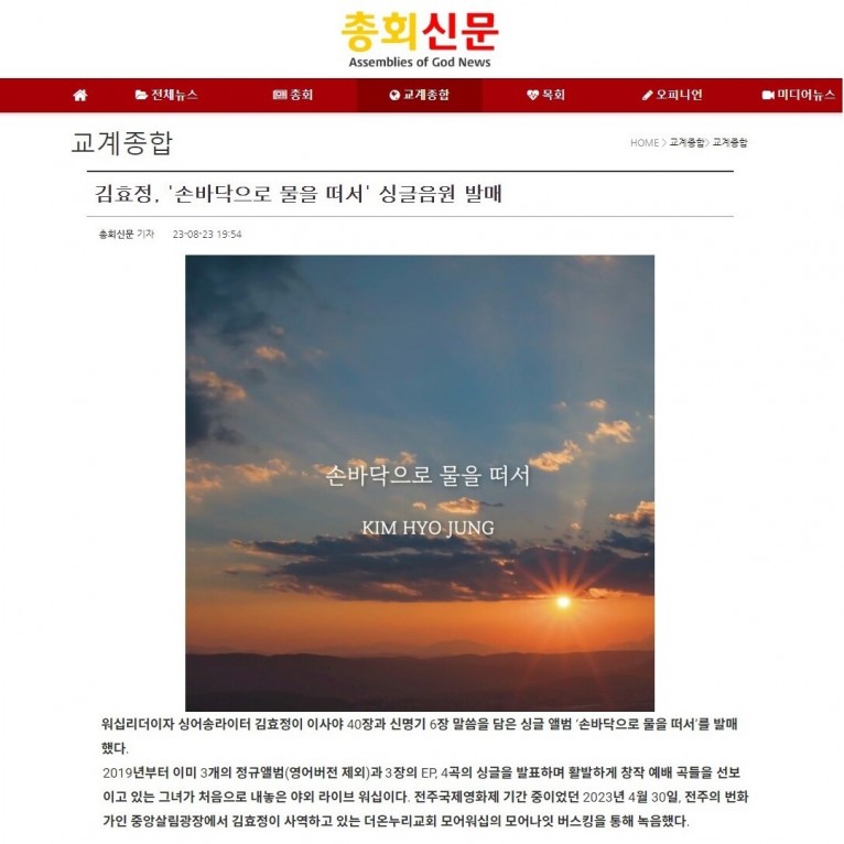 [기사] 김효정, '손바닥으로 물을 떠서' 싱글음원 발매(총회신문)