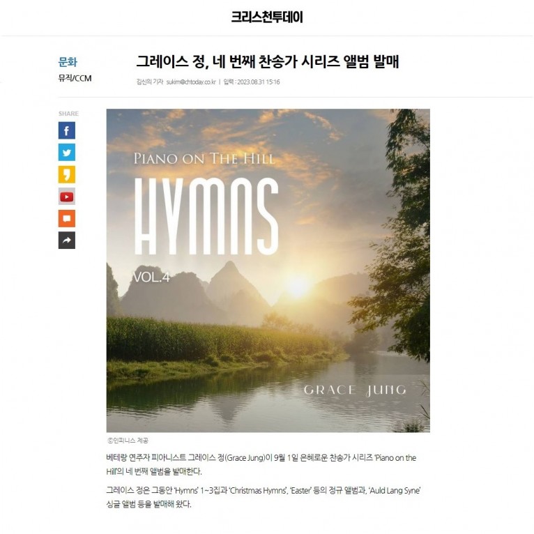 뮤직타임 [기사] 그레이스 정, 네 번째 찬송가 시리즈 앨범 발매(크리스천투데이)