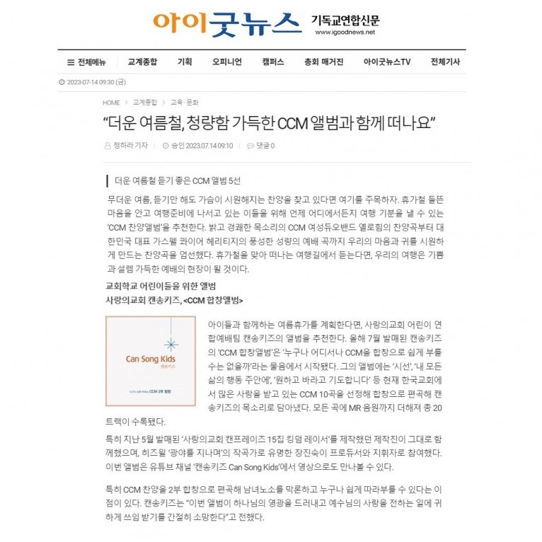 뮤직타임 [기사] “더운 여름철, 청량함 가득한 CCM 앨범과 함께 떠나요” 캔송키즈 앨범 발매(아이굿뉴스)
