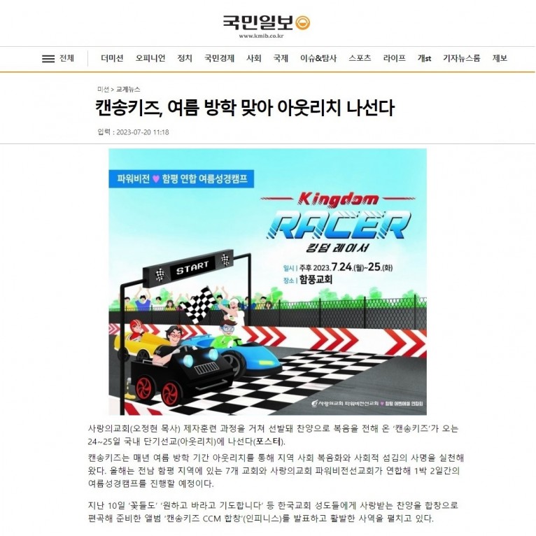 [기사] 캔송키즈, 여름 방학 맞아 아웃리치 나선다(국민일보)