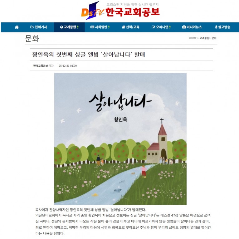 뮤직타임 [기사] 황인옥의 첫번째 싱글 앨범 ‘살아납니다’ 발매(한국교회공보)