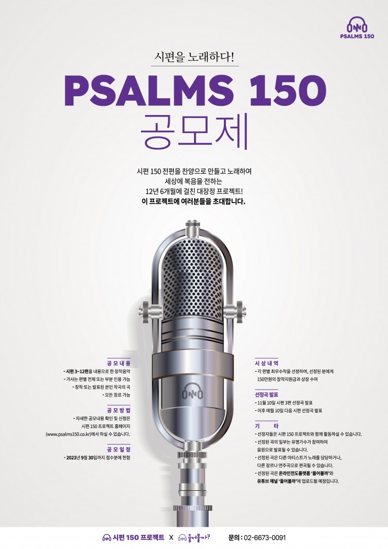 시편 150 프로젝트 준비위원회에서 장기 창작 프로젝트 ‘시편 150 프로젝트 공모전(Psalms 150)‘을 개최한다. 공모전 내용은 시편 3편에서 12편 내용을 기반으로 장르에 상관없이 성경 구절을 인용 및 참조하여 순수 창작곡을 작곡해 응모하는 것이다.