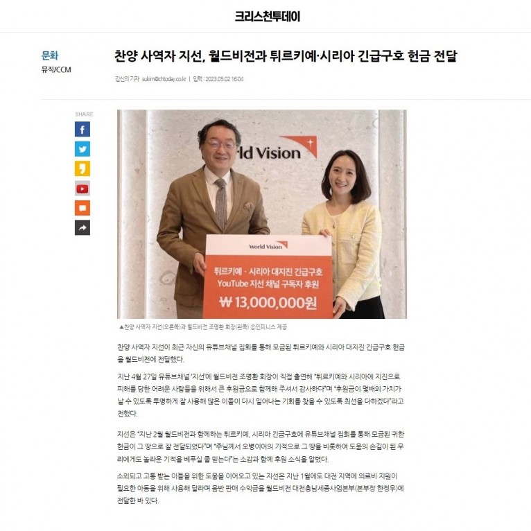 [기사] 찬양 사역자 지선, 월드비전과 튀르키예·시리아 긴급구호 헌금 전달(크리스천투데이)