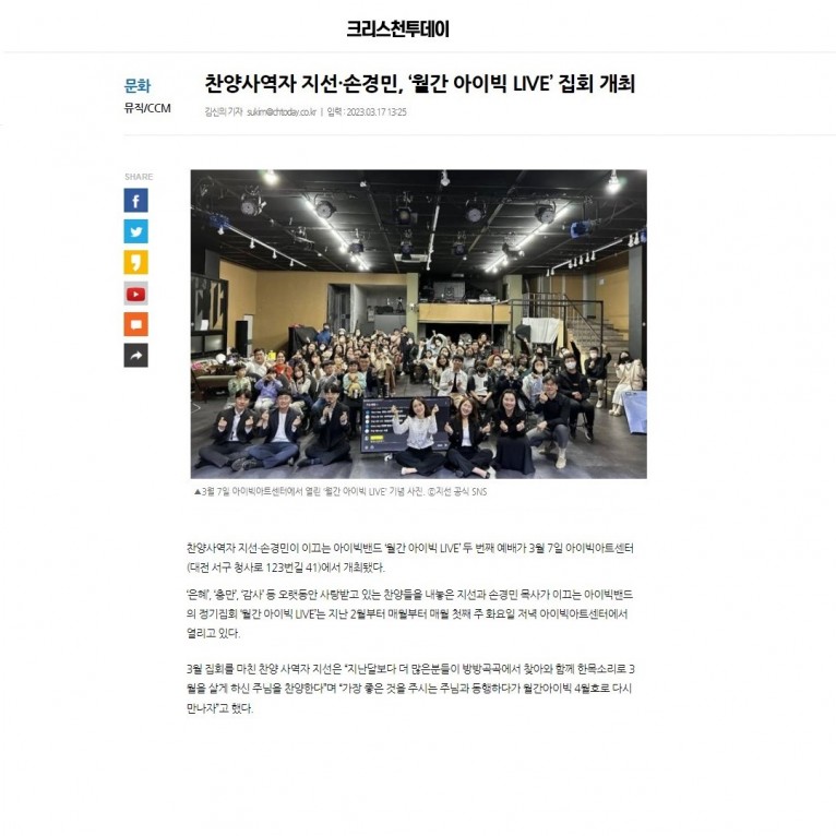 [기사] 찬양사역자 지선·손경민, ‘월간 아이빅 LIVE’ 집회 개최 (크리스천투데이)