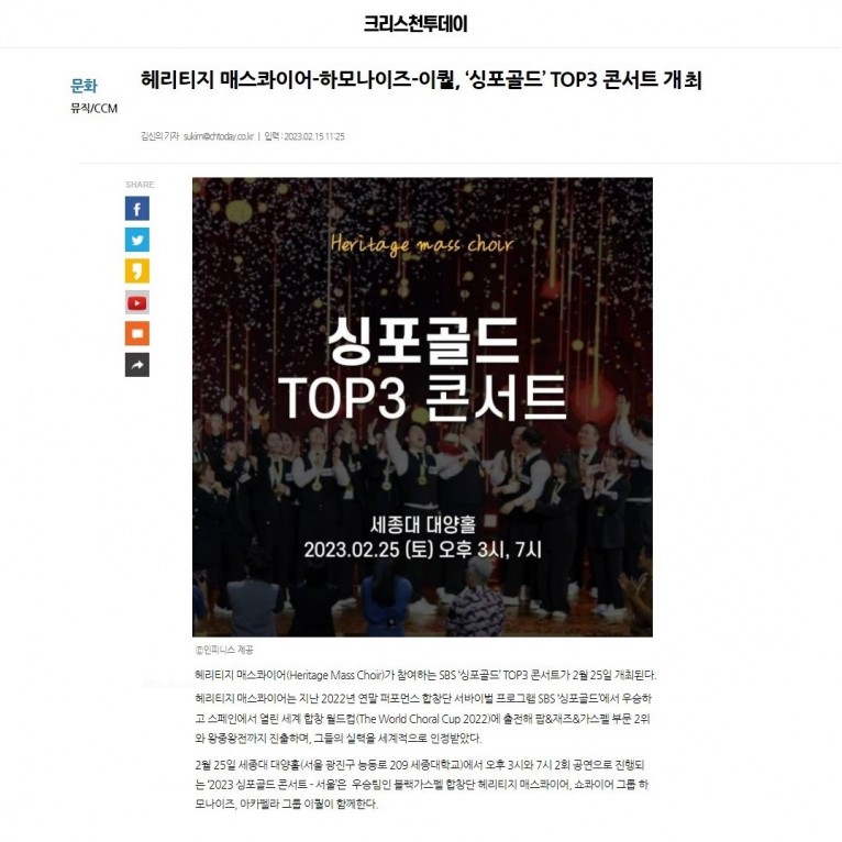 헤리티지 매스콰이어(Heritage Mass Choir)가 참여하는 SBS ‘싱포골드’ TOP3 콘서트가 2월 25일 개최된다.