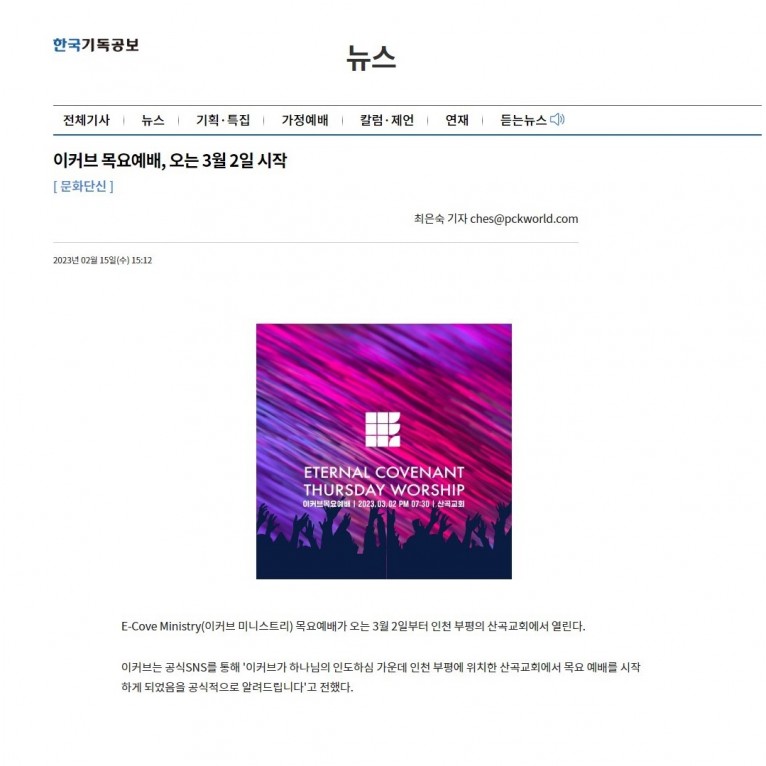 E-Cove Ministry(이커브 미니스트리) 목요예배가 오는 3월 2일부터 인천 부평의 산곡교회에서 열린다.
