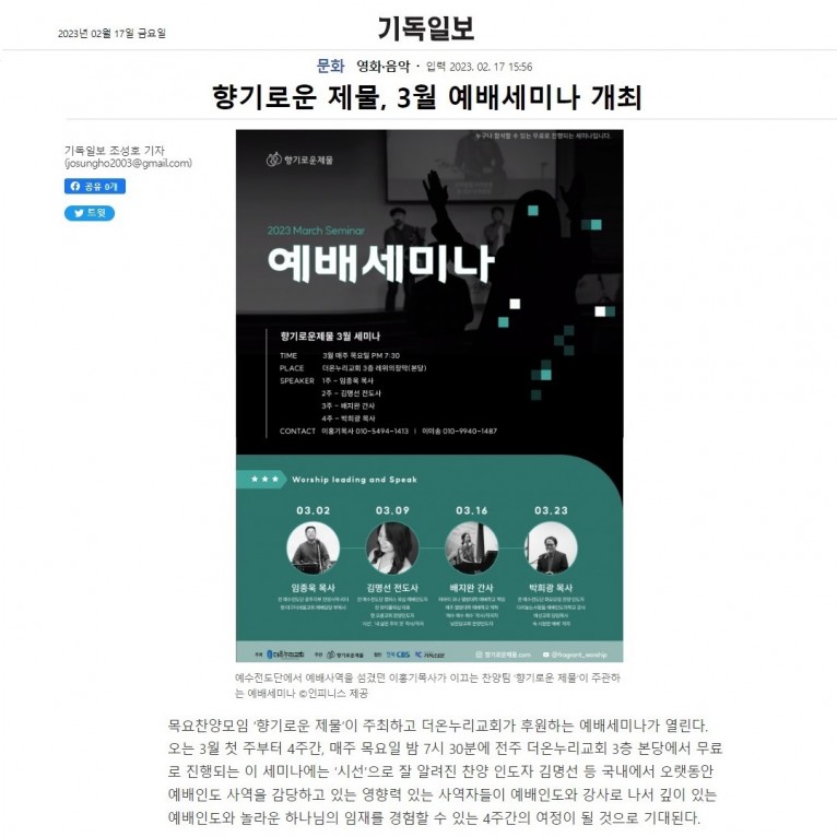 뮤직타임 [기사] 향기로운 제물, 3월 예배세미나 개최(기독일보)