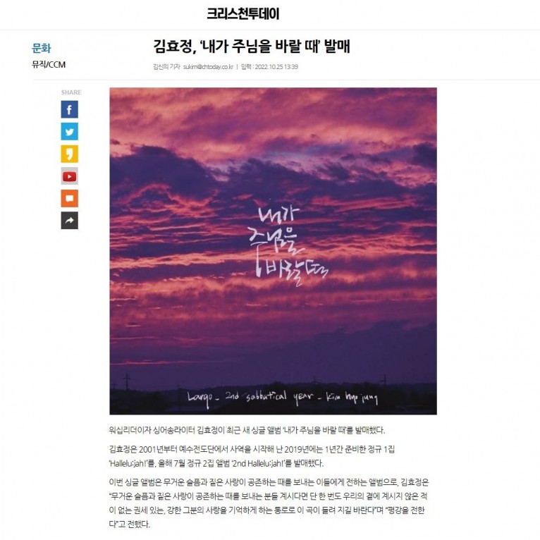 [기사] 김효정, ‘내가 주님을 바랄 때’ 발매