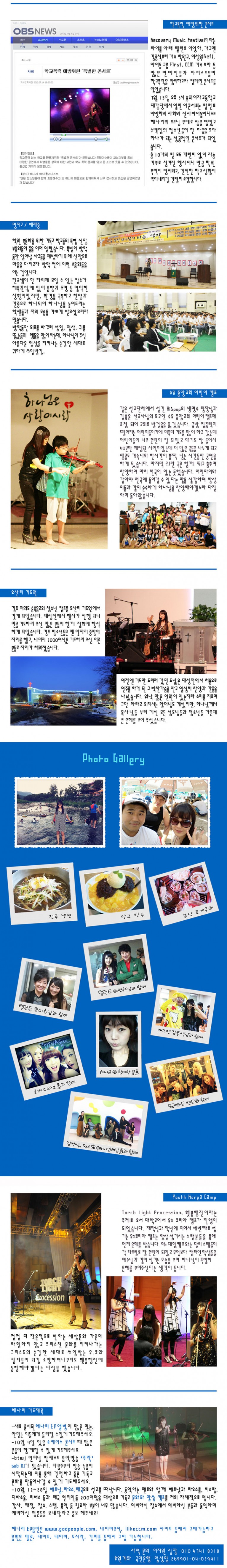 학교폭력 예방을 위한 콘서트 - 회복음악페스티벌이라는 타이틀 아래 탤런트 이영하, 개그맨 김종석부터 가수 박완규, 이성욱, 아이돌 그룹 퍼스트, CCM가수 보라 등 많은 연예인들과 함께한 학교폭력 방지 캠페인 콘서트, 학원 복음화를 위한 기독교 학교들의 신앙 부흥회 등 다양했던 해나리의 여름 사역소개