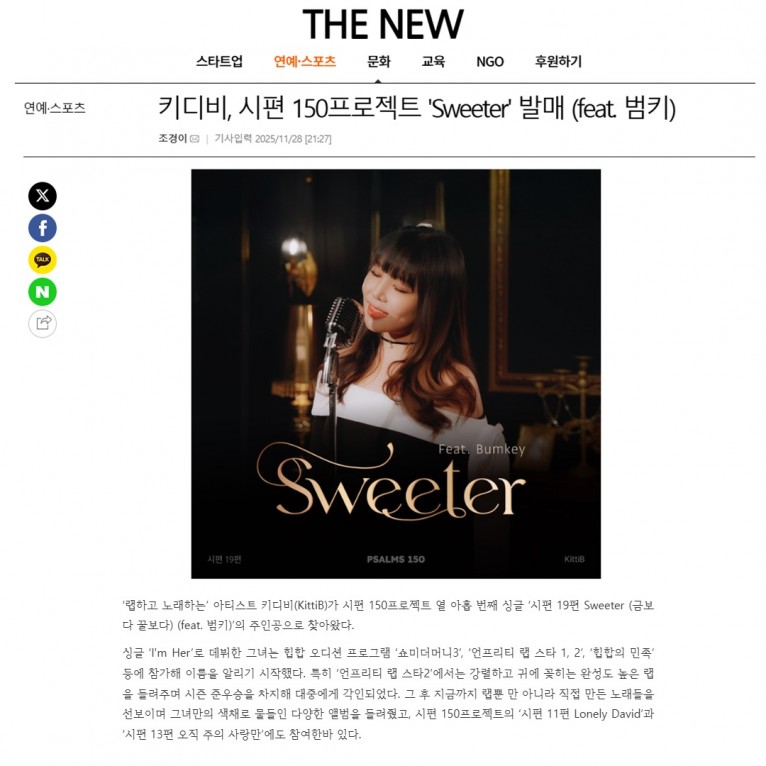 뮤직타임 [기사] 키디비, 시편 150프로젝트 'Sweeter' 발매 (feat. 범키)(THE NEW)