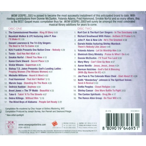 2003 가스펠계 최고의 초대형 합작 컴필레이션-WOW Gospel 2003!’ 매년 그 해 최고의 블랙 가스펠들을 컬렉션 해 소개해온 이 WOW Gospel 시리즈는 각각의 프로젝트가 골드(50만장) 혹은 플래티넘(백만장)을 기록해왔으며 WOW CCM보다는 2년 늦은 1998년에 첫 선을 보였다.