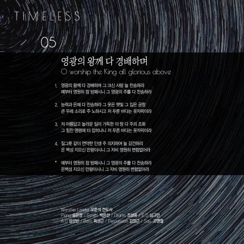 이번 앨범 ‘Timeless’는 제목 그대로 알파와 오메가, 처음과 나중 되시는 성삼위 하나님의 영원성을 담고 있다. 또한, 시대가 지나고 세대가 바뀌어도 변하지 않는 진리, 시간을 초월하는 복음의 영광을 선포하는 의미에서도 이 앨범이 담아내고 있는 찬양의 내용들은 영원하다. 영원한 생명은 예수 그리스도를 아는 것과 유일하신 참 하나님을 아는 것에 의해 주어진다. 십자가에서 죽으시고 부활하신 예수님을 믿을 때 영원한 생명은 실체가 된다. 타이틀곡인 ‘잠시 세상에’를 통해 이 땅 위에 살아가는 모든 성도들이 껍데기 예배가 아닌 믿음의 실체로 삶의 예배를 드리며 진리를 수호하는 참된 그리스도의 제자로 거듭나기를 소망한다.