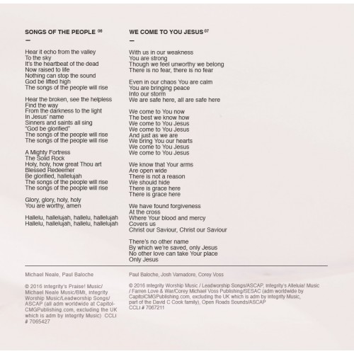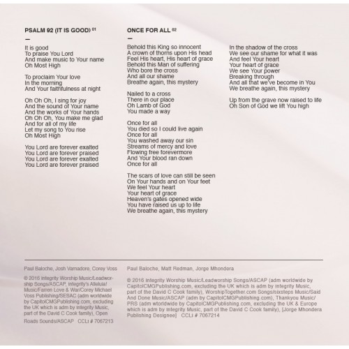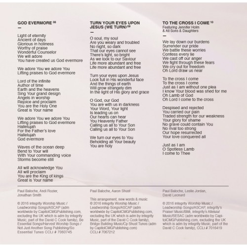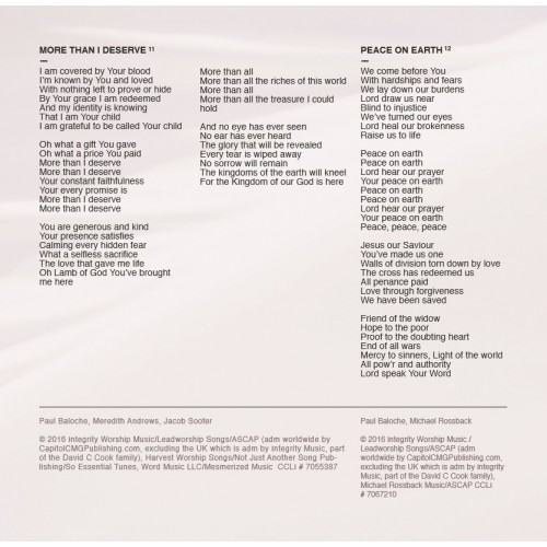 Featured Vocalists: Josh Varnadore: “Psalm 92 (It Is Good)” Madison Cunningham: “We Come To You Jesus”, “Peace On Earth” Jennifer Holm: “To The Cross I Come” David Leonard & Leslie Jordan (All Sons & Daughters): “To The Cross I Come” Meredith Andrews: “More Than I Deserve” Aaron Shust: “God Evermore”